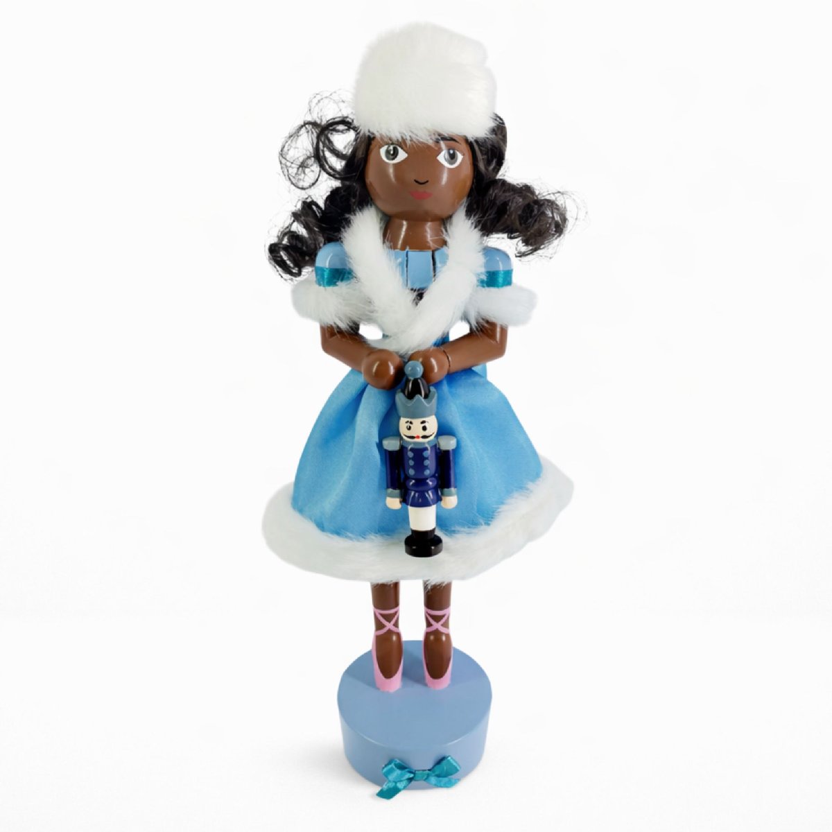 A sweet, wintery ballerina that merchandises beautifully in Nutcracker season and beyond. The icy blue dress with plush white faux-fur trim creates a “Snow Scene” look that pops on boutique shelves, while the mini nutcracker accessory makes it an irresistible gift pick.