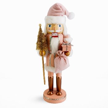 Santa Nutcracker Pink White and Gold with Tree and Gift Sack 12 Inch