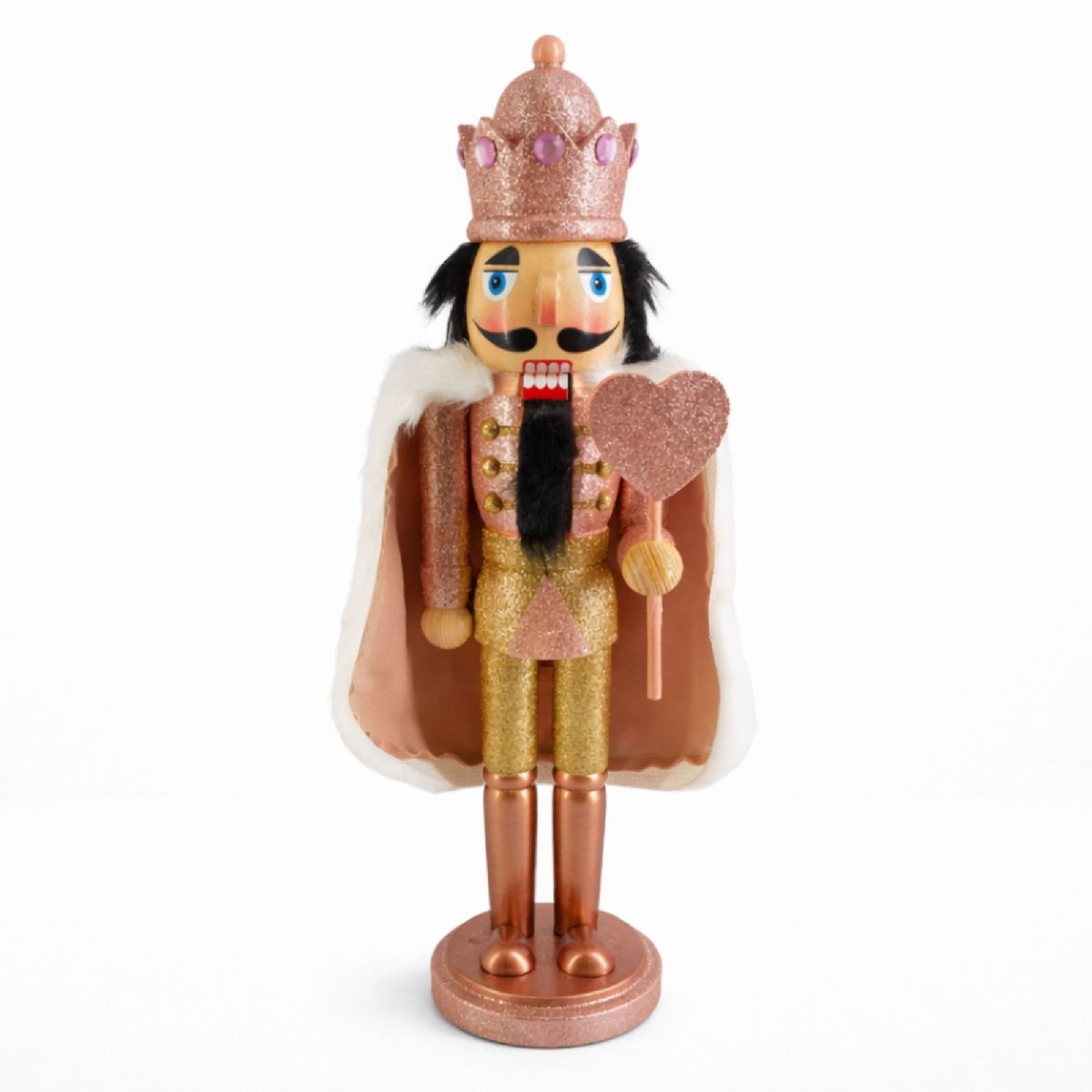 Finished in pink-gold glitter with jewel accents, this crowned king carries a heart-shaped scepter for a whimsical, love-forward twist on classic nutcracker decor. Metallic boots and layered textures give it a premium, collectible feel.