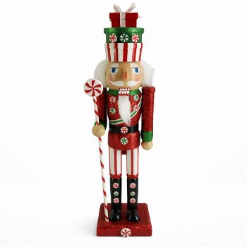 This 15 inch Peppermint Soldier Nutcracker features red glitter, candy-striped details, and a peppermint-topped candy cane staff for high-energy holiday candy displays.