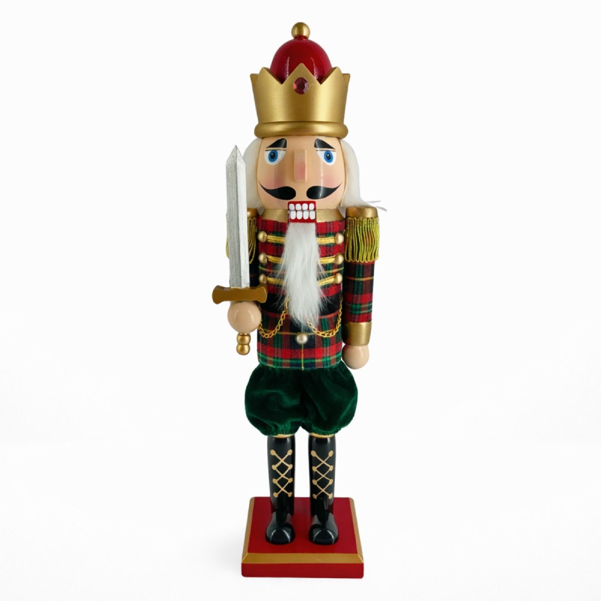 This 15 inch King Nutcracker features a tartan plaid jacket, gold crown, and silver sword—an elevated twist on classic Christmas color stories.
