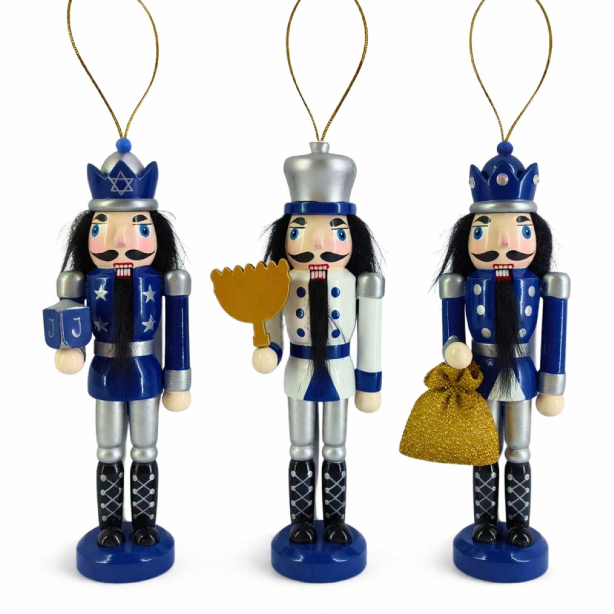 A distinctive addition to holiday assortments, this set of 3 Hanukkah nutcracker ornaments offers retailers a meaningful themed option with strong visual coherence. The blue, silver, and white palette reads clearly for Hanukkah merchandising while the familiar nutcracker form keeps the set collectible and gift-friendly.
